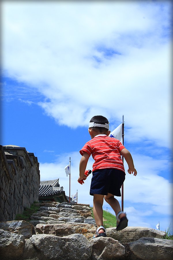 어느 화창한 날에 화성을 오르는 아이의 모습