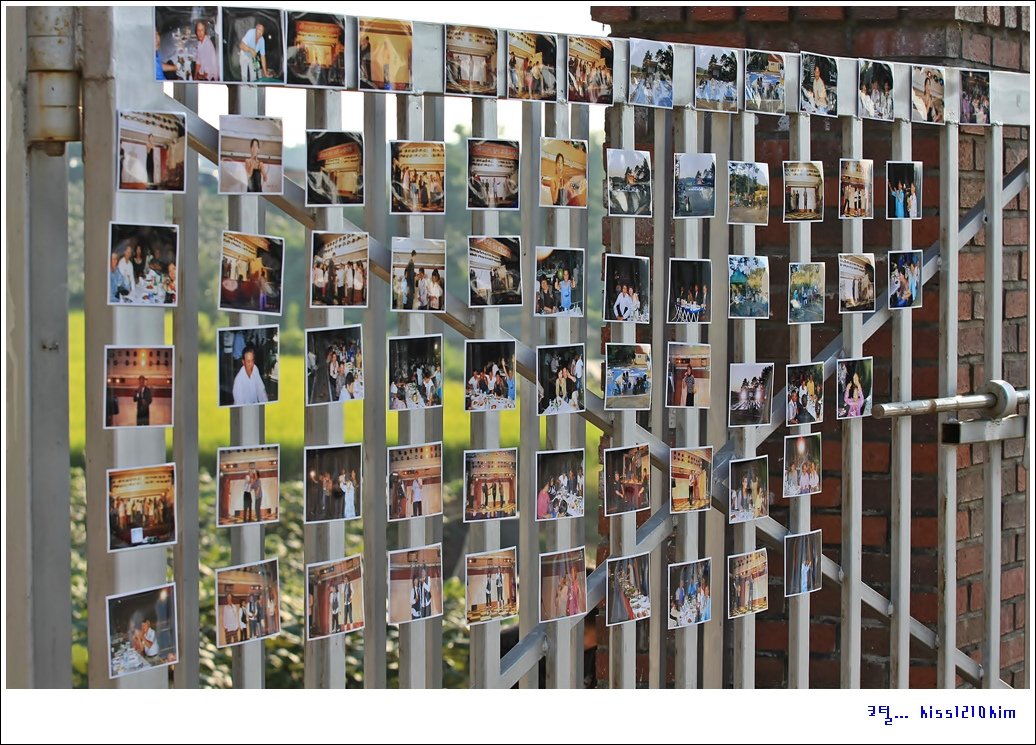 어느 단체 행사사진을 전시해놓은것가 봐요!! 구조물을 활용하는 센스가 ... -