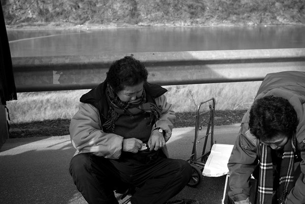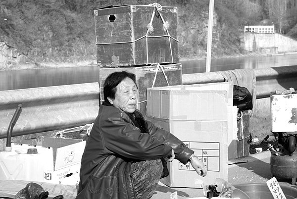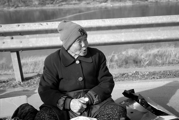 물건이 팔리지 않아 걱정하는 허리가 휘어져 가는 할머님들의