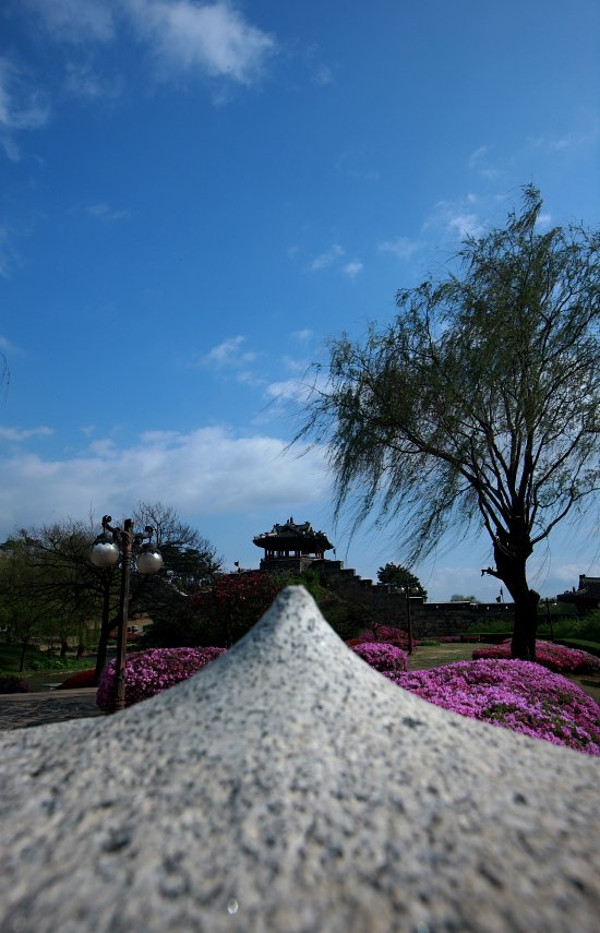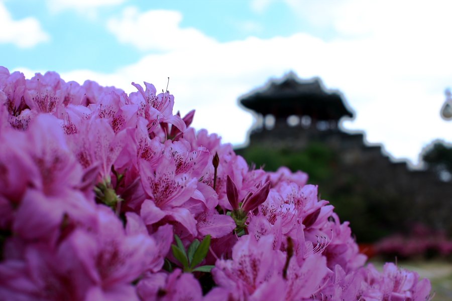 하늘과 구름과 꽃들이 어우러진 방화수류정..
