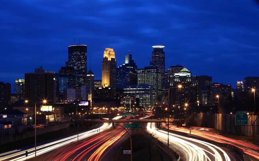 미니애폴리스(미네소타주)의 도시 중심에 있는 고층빌딩의 야경을 담아보고자,