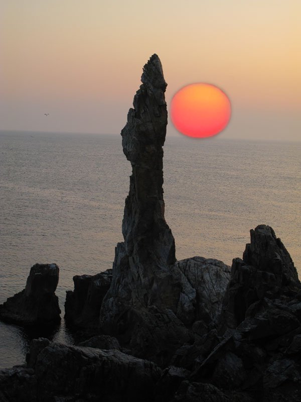 태양이 큼직하니 촛대바위와 형제의 연을 밎고 있네요