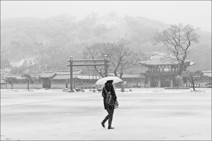 한적한 행궁에 홀로 걷는 여인 멋진 설경입니다.
