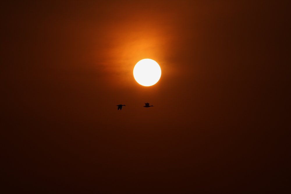 황금빛 노을에 해ㅡ를 벗삼아 날아가는 새( 고니인지 오리인지)