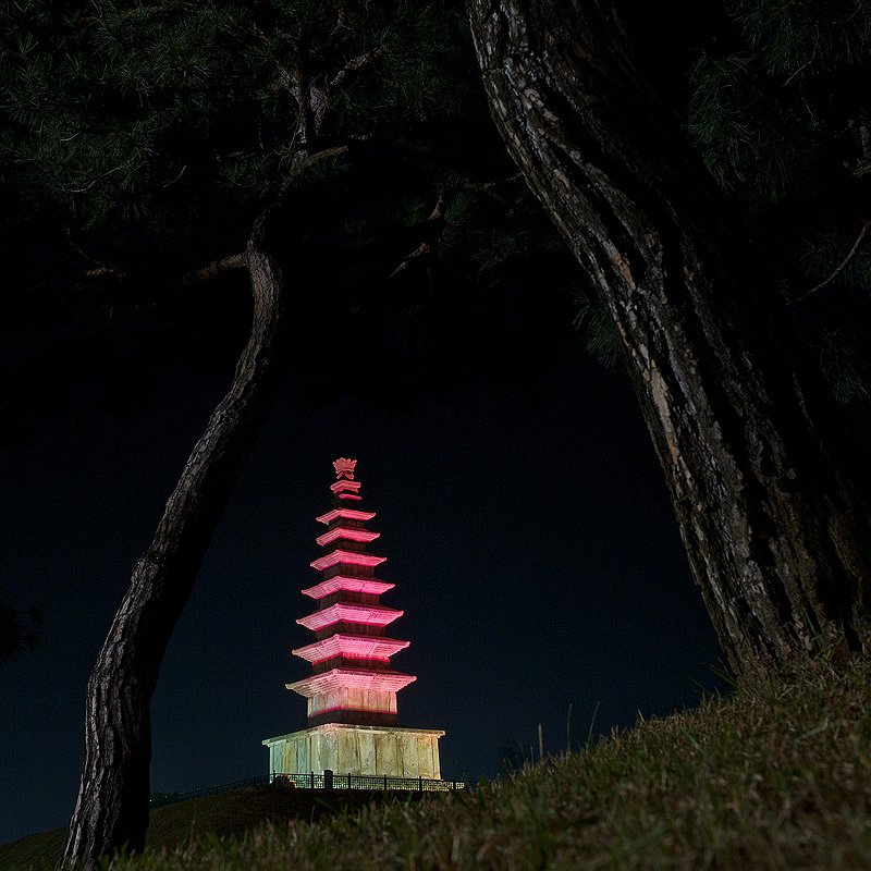 소나무의 질감이 느껴지며 그 사이로 보이는 조명받은 주앙탑이 시선을 잡습니다