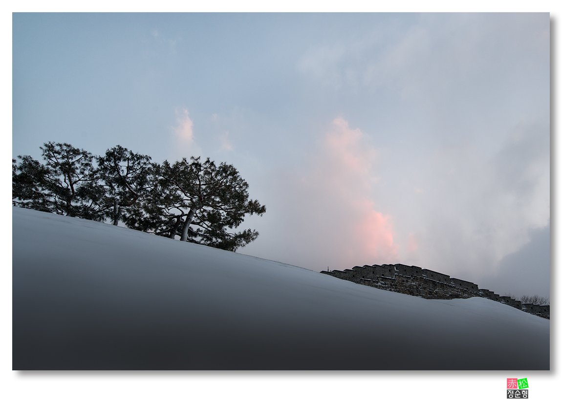소복히 쌓인 눈 위로 보이는 소나무와 성