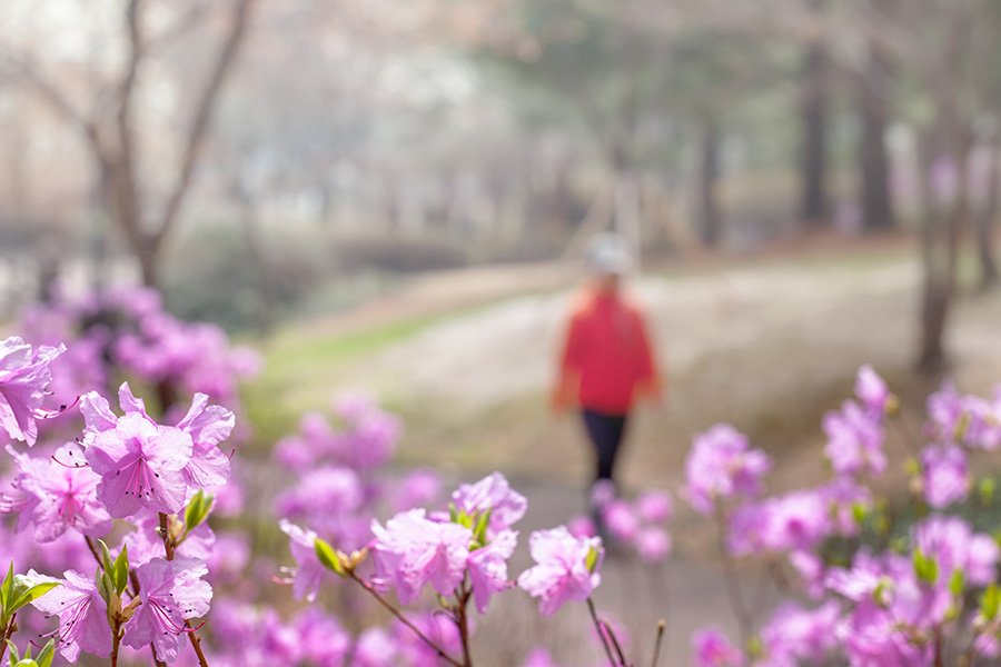 진달래가 활짝핀 화사한 봄날씨에 산책하는 사람들 한폭의 그림입니다.