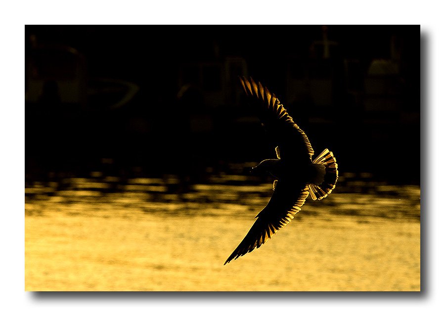 황금빛 노을을 타고 갈매기가 아주 멋들어지게 날고 있네요~